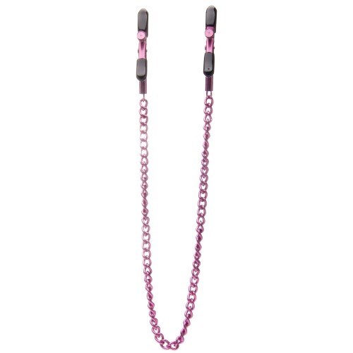 Faça com que as suas fantasias sejam ainda mais sensuais com as ADJUSTABLE NIPPLE CLAMPS. As pinças e a corrente de metal, foram concebidas com aço inoxidável, alumínio e são sem níquel. As pinças são ajustáveis e revestidas com borracha, são unissexo e muito fáceis de utilizar, para isso basta apertar a pinça de mola sobre o mamilo e ajustar o parafuso, até obter a tensão preferida. Os terminais estão ligados entre si, por uma sóbria corrente, que lhe confere um toque mais selvagem.